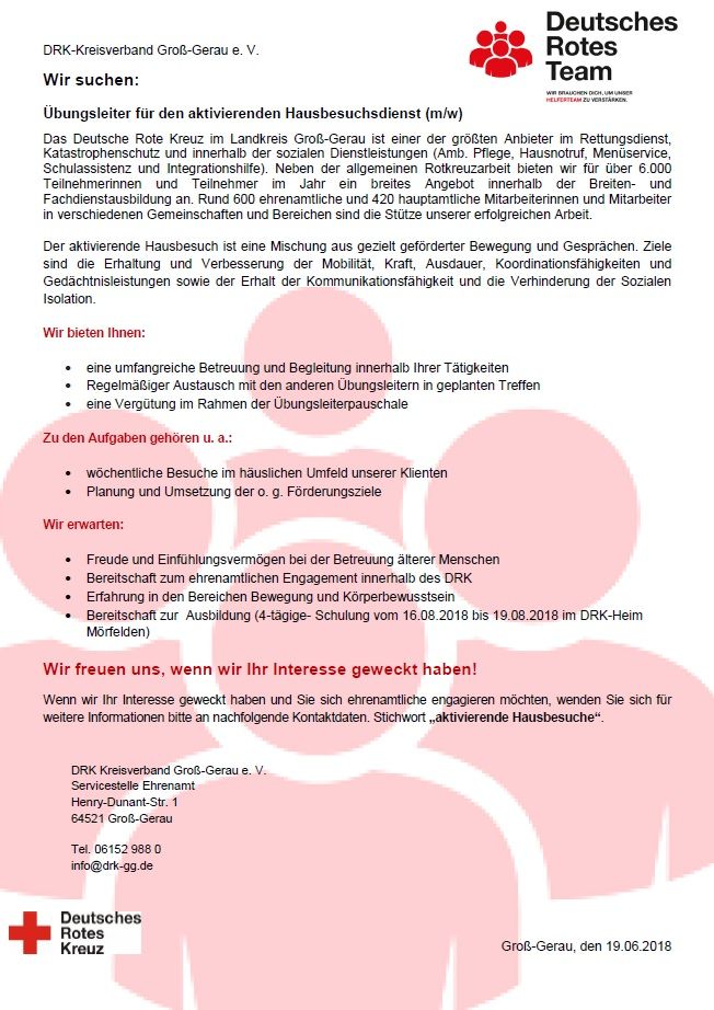 Für unser neues Angebot, den aktivierenden Hausbesuchsdienst, suchen wir Übungsleiter (m/w). Der aktivierende Hausbesuch ist eine Mischung aus gezielt geförderter Bewegung und Gesprächen. Ziele sind die Erhaltung und Verbesserung der Mobilität, Kraft, Ausdauer, Koordinationsfähigkeiten und Gedächtnisleistungen sowie der Erhalt der Kommunikationsfähigkeit und die Verhinderung der Sozialen Isolation.